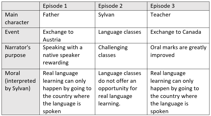 This anecdote is paragraphed into its three narrative sections. The first paragraph begins with the teacher as a person and her experience as a language learner and exchange student. This is followed by comments on how the exchange improved this teacher’s past students’ academic performance in speaking as well as in other linguistic areas. Finally, Sylvan concludes on a remark that makes the connection between a greater mark in the oral assessment and the ability to hold a genuine conversation in the target language.